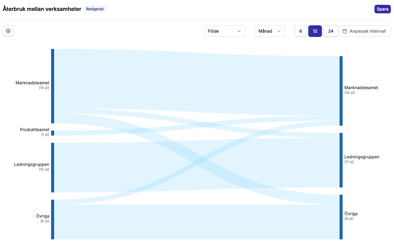 I en rapport går det nu att välja "annonserad av avdelning" respektive "beställd av avdelning" som segmentering för att se återbruksstatistik nedbrutet per avdelning. Detta kompletterar tidigare möjligheter att segmentera på plats eller person.