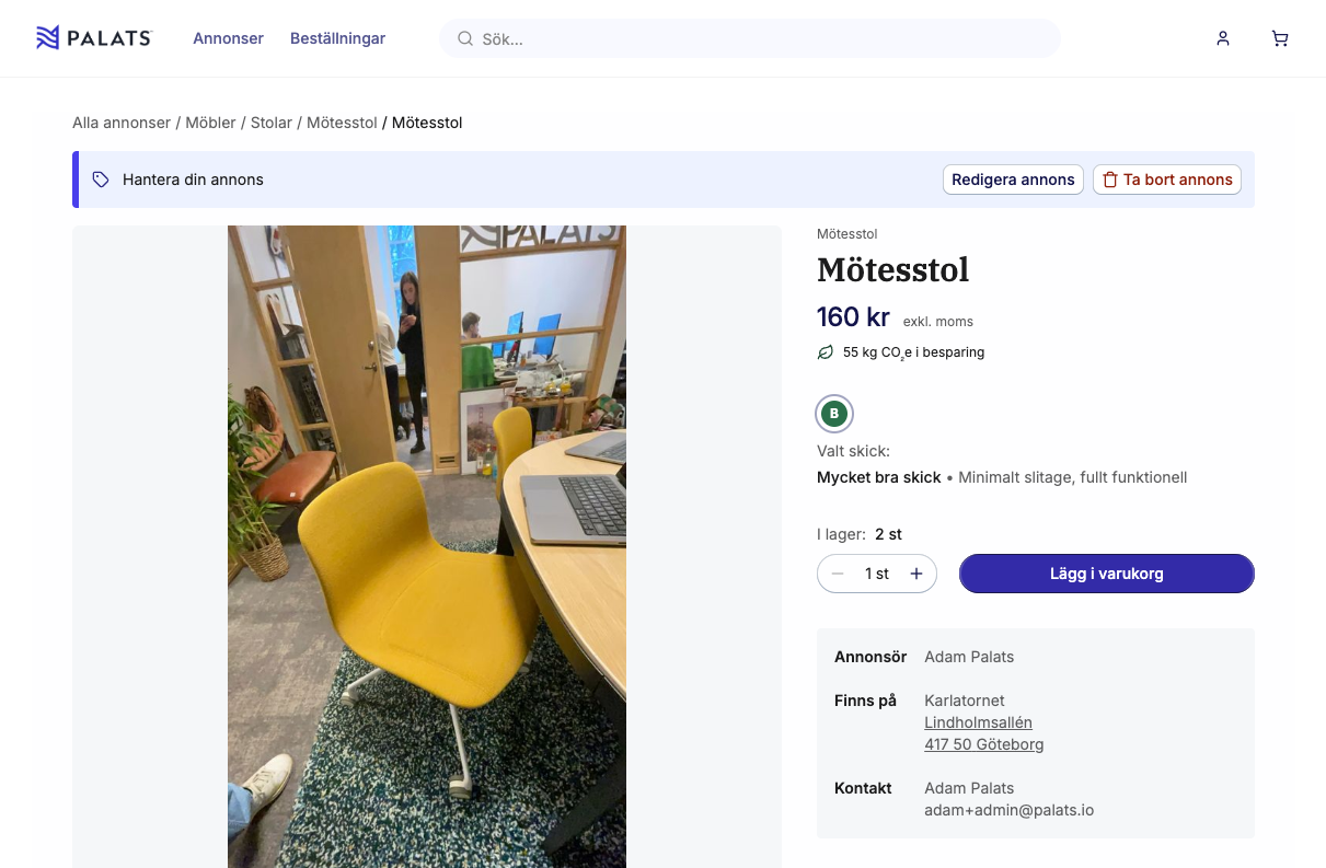 Genom att göra det lättare att hantera sina annonser och beställningar på marknadsplatsen så säkerställer vi att annonserna som syns på marknadsplatsen är aktuella och att beställningar fullföljs när de är hanterade. Detta är en viktig pusselbit i vårt uppdrag att göra återbruk lika attraktivt som nyköp!