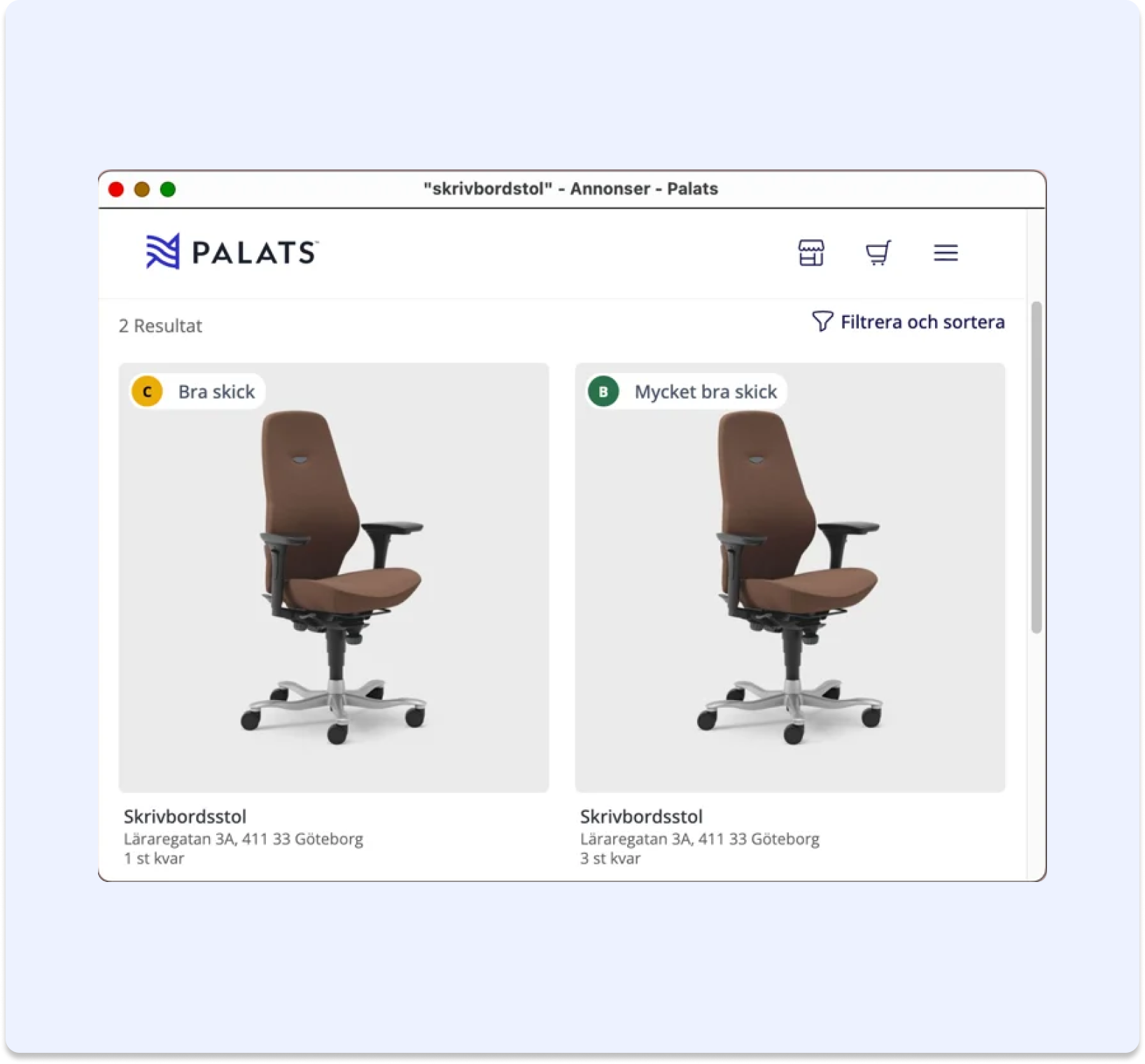 Annonsera återbrukbara möbler så att medarbetare kan hitta, reservera och hämta ut vad de behöver.
